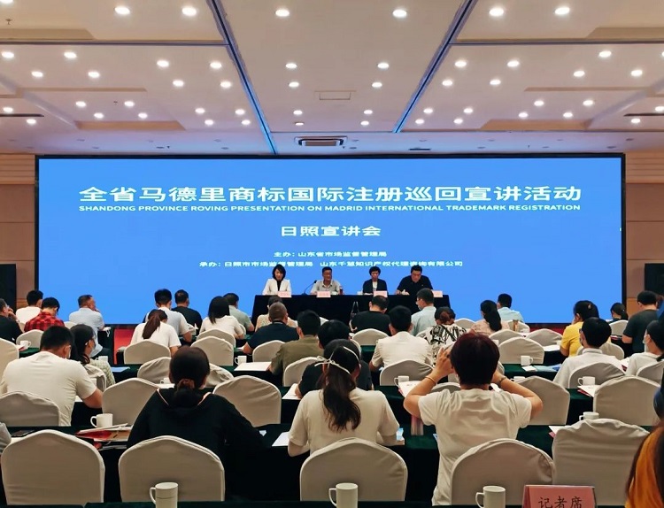 為進一步加強品牌強省建設,貫徹落實山東省政府辦公廳知識產(chǎn)權“春筍行動”工作部署及國家知識產(chǎn)權局“知識產(chǎn)權服務萬里行”工作要求,更好地推進全省馬德里商標國際注冊與保護工作,提升企業(yè)品牌國際化運營和商標馬德里國際注冊保護水平,8月19日上午,由山東省市場監(jiān)督管理局主辦、日照市市市場監(jiān)督管理局承辦、山東千慧知識產(chǎn)權代理咨詢有限公司協(xié)辦的“山東省馬德里商標國際注冊巡回宣講活動”圓滿舉辦。日照市市場監(jiān)管局副局長范文青、科長陳剛,山東千慧知識產(chǎn)權代理咨詢有限公司副總經(jīng)理張崢、賈俊穎出席此次活動。