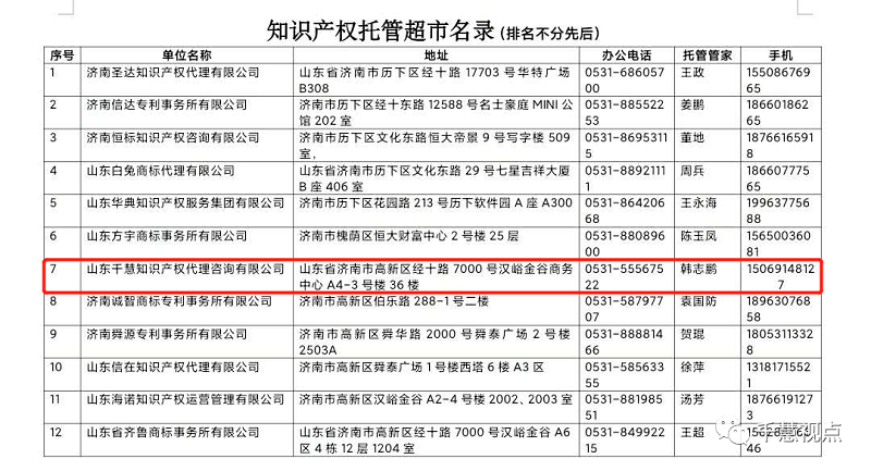 今日,濟(jì)南市市場監(jiān)管局(市知識產(chǎn)權(quán)局)公布納入2020年度“知識產(chǎn)權(quán)托管超市”的“管家”名單,山東千慧知識產(chǎn)權(quán)代理咨詢有限公司通過企業(yè)申報,第三方專家評審組評審,被納入“托管超市”名單。