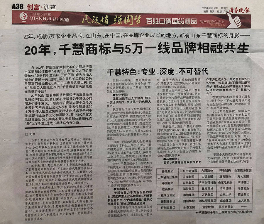 20年風(fēng)雨,隨著中國(guó)從數(shù)量經(jīng)濟(jì)向質(zhì)量經(jīng)濟(jì)品牌經(jīng)濟(jì)的邁進(jìn),昔日關(guān)心千慧并為千慧憂心的朋友們終于發(fā)現(xiàn),千慧商標(biāo)在商海大潮中迄今為止累計(jì)客戶總量已超過(guò)5萬(wàn)家,業(yè)務(wù)代理量達(dá)30多萬(wàn)件,使大批企業(yè)免除侵權(quán)訴訟,搶占競(jìng)爭(zhēng)對(duì)手先機(jī),助推企業(yè)多元化和國(guó)際化。其中,300余家大品牌更是因?yàn)殚L(zhǎng)期離不開(kāi)其專業(yè)到位的服務(wù),而“賴”上了千慧,達(dá)成長(zhǎng)期戰(zhàn)略合作關(guān)系。