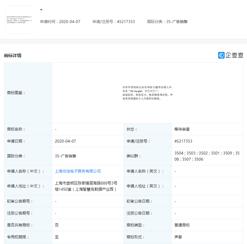 目前,李佳琦持股的上海妝佳電子商務(wù)有限公司所申請(qǐng)的“oh my god 買(mǎi)它買(mǎi)它”聲音商標(biāo),狀態(tài)為等待審查,最終結(jié)果如何,還有待相關(guān)部門(mén)的審核、確認(rèn)。