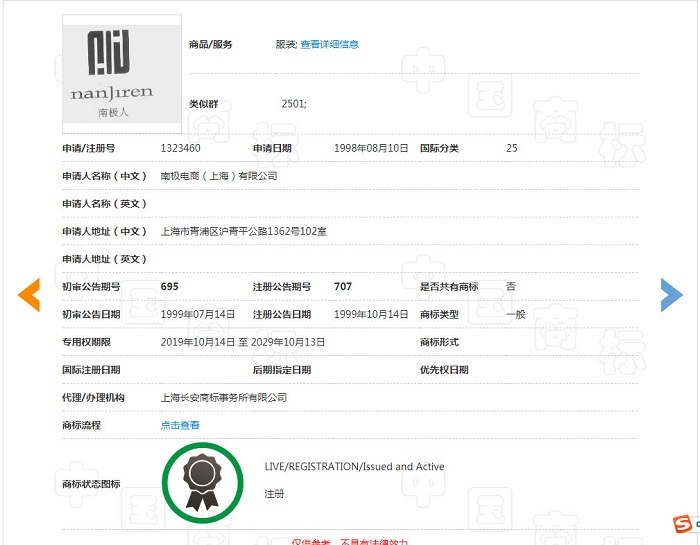 其中第一件南極人商標(biāo)申請(qǐng)于1998年8月10日,目前核準(zhǔn)使用在第25類服裝。