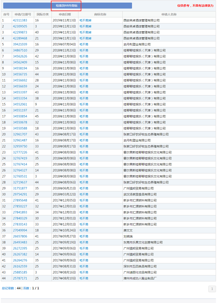 商標(biāo)局網(wǎng)站數(shù)據(jù)顯示,截至2020年7月19日,有關(guān)毛不易的商標(biāo)申請目前為44件,其中,申請人為哇唧唧哇娛樂(天津)有限公司的申請只有14件,還有5件為霍爾果斯哇唧唧哇娛樂文化有限公司申請,其余25件均來自于其他公司。被搶注的毛不易商標(biāo)類別包括16類辦公用品、33類酒、43類餐飲住宿、44類醫(yī)療園藝、35類廣告銷售、29類食品等,涉及國內(nèi)多家公司。