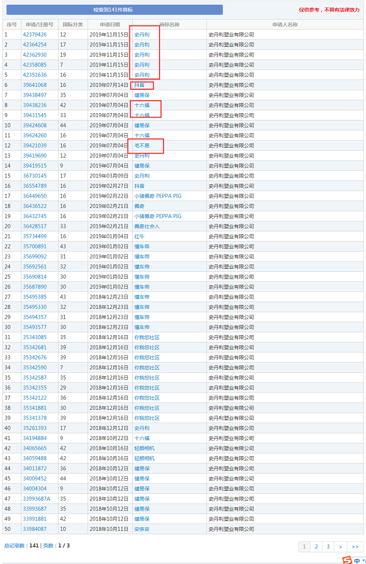 此外,還有網(wǎng)友發(fā)現(xiàn),搶注毛不易商標(biāo)的還有一個公司——史丹利(此史丹利,非彼史丹利)。查詢顯示,史丹利塑業(yè)有限公司相關(guān)知識產(chǎn)權(quán)信息共141條,包含史丹利、毛不易、十六福、抖音、小豬佩奇 PEPPA PIG、佩奇、佩奇社會人、紅牛、懂車帝、你我您社區(qū)、輕顏相機等商標(biāo)。