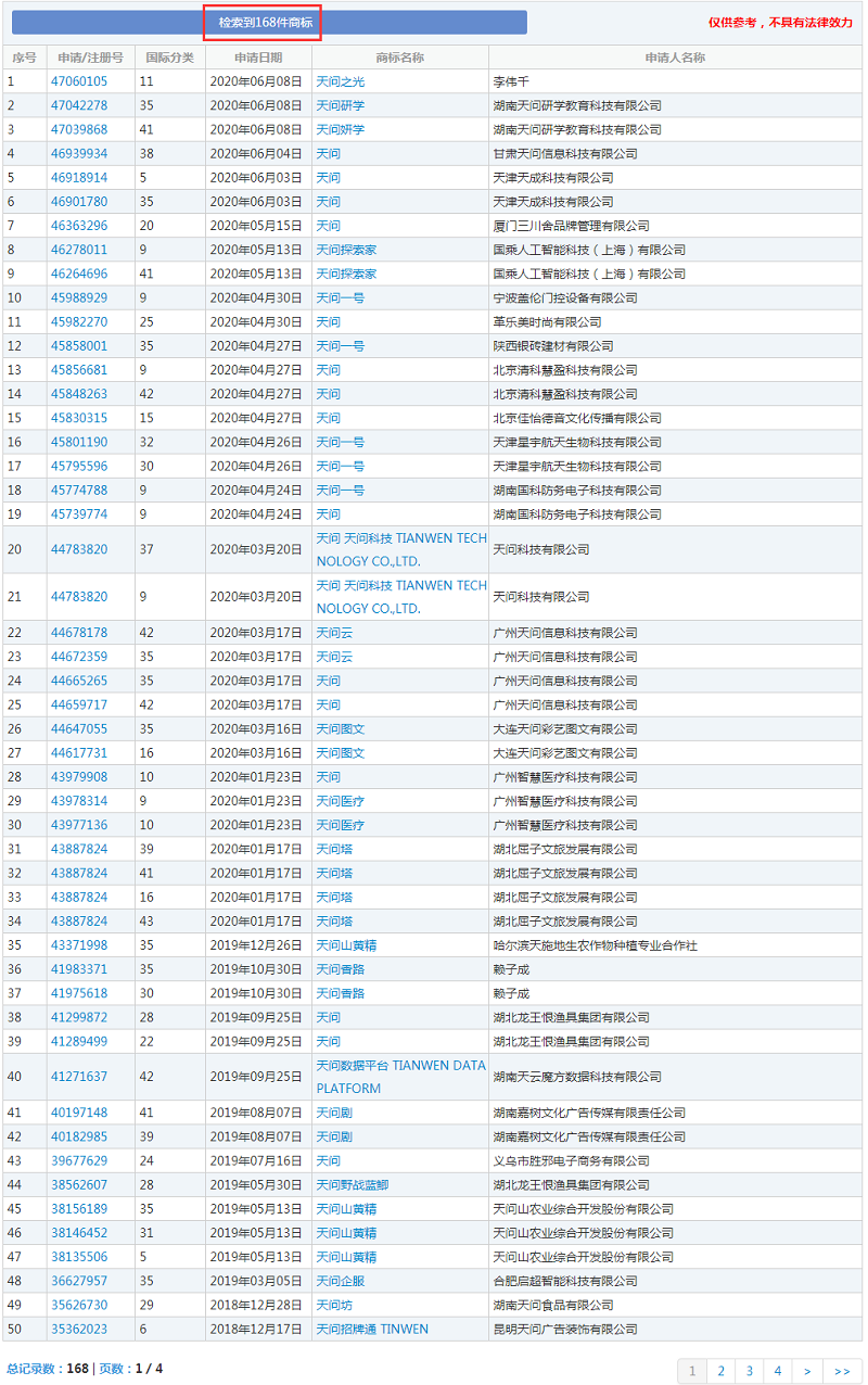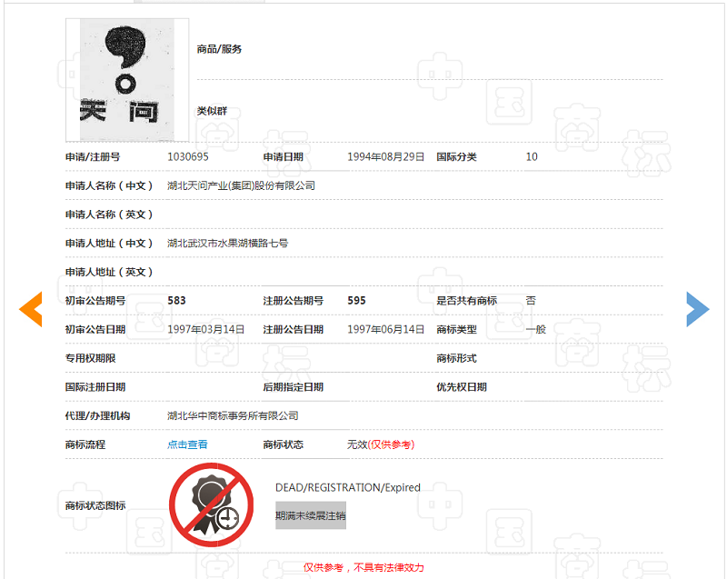 在1994年8月申請了第一件“天問”商標,目前由于期滿未續(xù)展已經(jīng)被注銷。