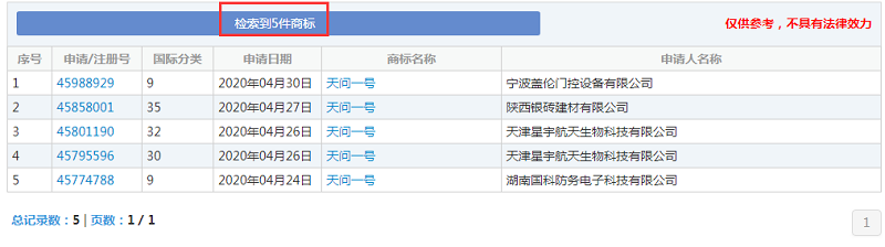 商標網(wǎng)數(shù)據(jù)顯示,截止7月24日,有關(guān)“天問一號”的商標申請共5條,申請公司包含湖南國科防務(wù)電子科技有限公司、天津星宇航天生物科技有限公司、寧波蓋倫門控設(shè)備有限公司、陜西銀磚建材有限公司,商標狀態(tài)均為等待實質(zhì)審查。