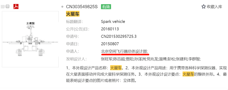 雖然“天問一號”商標遭到搶注,但是“火星車”外觀專利早在2015年8月就已經(jīng)被申請。