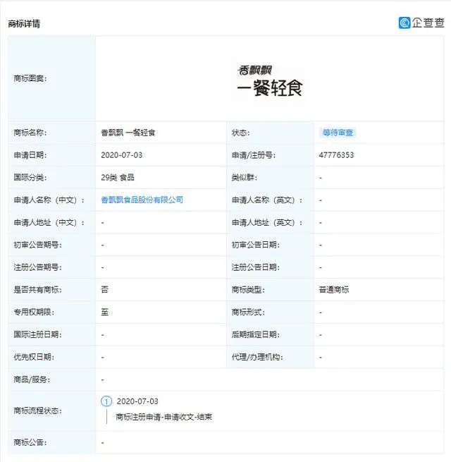 8月5日,記者從天眼查APP查詢到,香飄飄食品股份有限公司新增多條商標(biāo)信息,其中包括了“香飄飄 一餐輕食”,申請日期為2020年7月3日,商標(biāo)狀態(tài)為“等待實(shí)質(zhì)審查”,分類包括方便食品、啤酒飲料、食品。