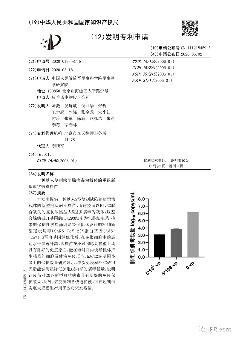 據(jù)國家知識產(chǎn)權(quán)局介紹,經(jīng)核,該疫苗專利申請發(fā)明名稱為“一種以人復(fù)制缺陷腺病毒為載體的重組新型冠狀病毒疫苗”,該專利申請?zhí)枮?02010193587.8,申請人為中國人民解放軍軍事科學(xué)院軍事醫(yī)學(xué)研究院和康希諾生物股份公司,發(fā)明人為陳薇等,申請日為2020年3月18日,經(jīng)提交優(yōu)先審查請求后,國家知識產(chǎn)權(quán)局于2020年8月11日發(fā)出專利授權(quán)通知書,待申請人依法辦理專利權(quán)登記手續(xù)后,該局將公告授權(quán)該專利。