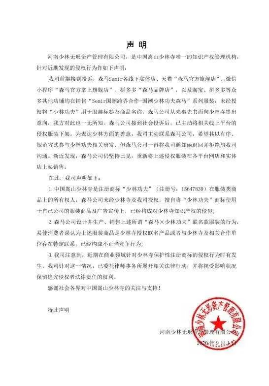 9月1日,嵩山少林寺發(fā)布聲明,稱嵩山少林寺是注冊商標(biāo)“少林功夫”在服裝類商品上的所有權(quán)人,森馬在各平臺在售的“Semir國潮跨界合作-國潮少林功夫森馬”系列服裝,未經(jīng)授權(quán)將“少林功夫”用于服裝標(biāo)簽及商品名稱,已侵犯少林寺知識產(chǎn)權(quán)。