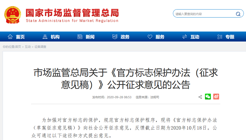 9月28日,國家市場監(jiān)督管理總局網站發(fā)布了市場監(jiān)管總局關于《官方標志保護辦法(征求意見稿)》公開征求意見的公告。公眾可通過登錄中華人民共和國司法部 中國政府法制信息網、登錄國家市場監(jiān)督管理總局網站、電子郵件、信函四種途徑和方式提出意見。反饋截止日期為2020年10月18日。