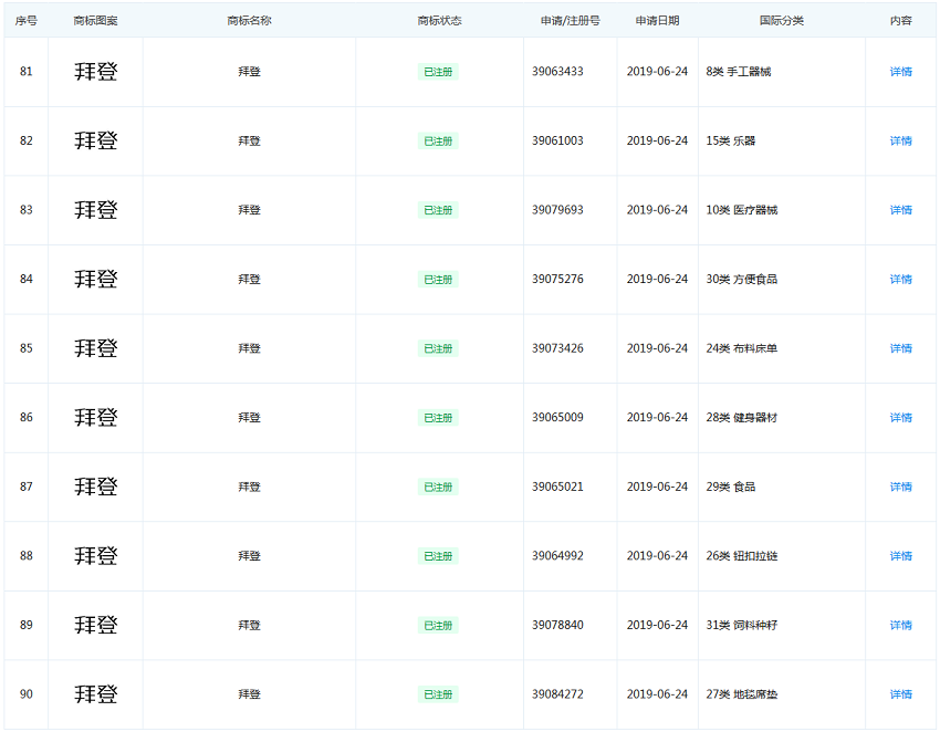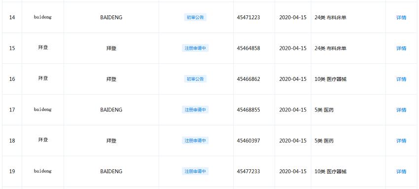 江蘇拜登實業(yè)有限公司申請了6“拜登”及“baideng”商標,其中兩件商標已初審公告,商標核準類別主要為第24類布料床單、第10類醫(yī)療器械等。