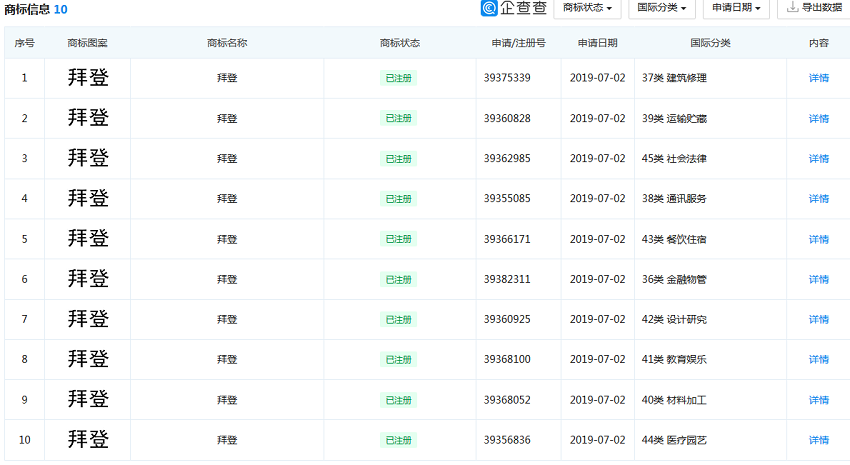 其中,據(jù)企查查數(shù)據(jù)顯示拜登(上海)置業(yè)發(fā)展有限公司申請的10件“拜登”商標均已成功注冊,商標核準類別包括,第37類、第39類、第45類、第38類、第42類等多種類別。