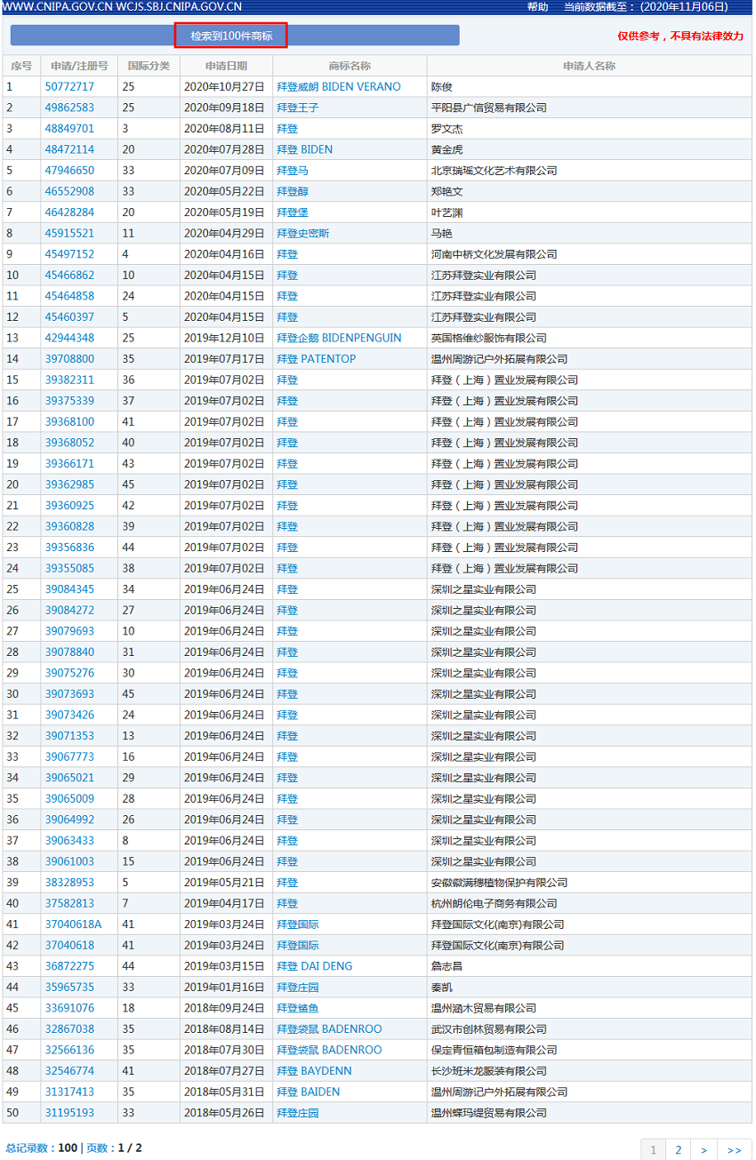 據(jù)中國商標網(wǎng)查詢可知,截止2020年11月6日,申請“拜登”相關商標的有106件。
