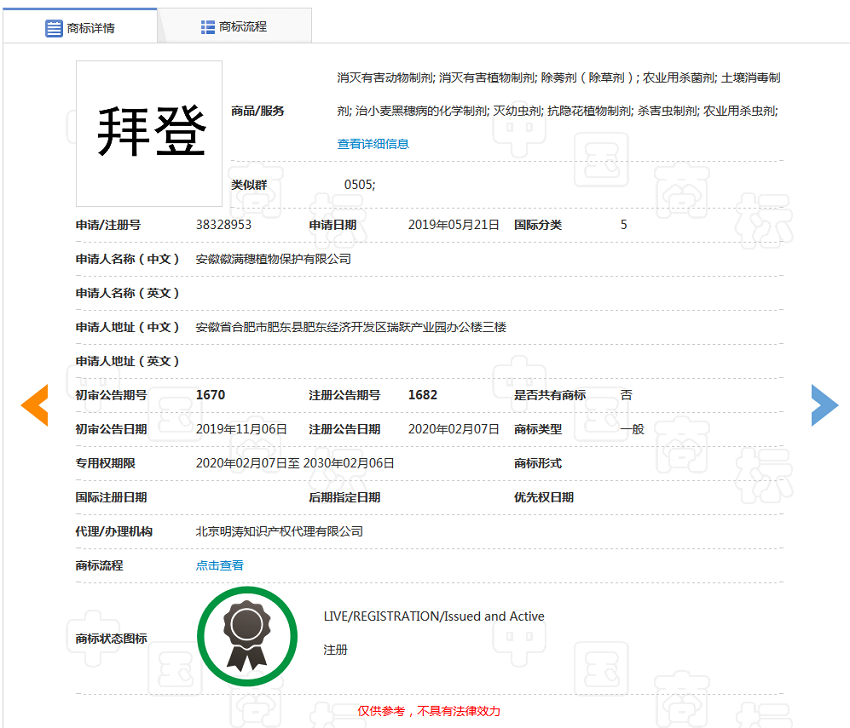 其中2019年4月25日之后第一個申請“拜登”商標的為安徽徽滿穗植物保護有限公司,第38328953號商標為2019年5月21日申請,核準使用類別為第5類,主要用于消滅有害動物制劑; 消滅有害植物制劑;等商品服務,目前商標已成功注冊。