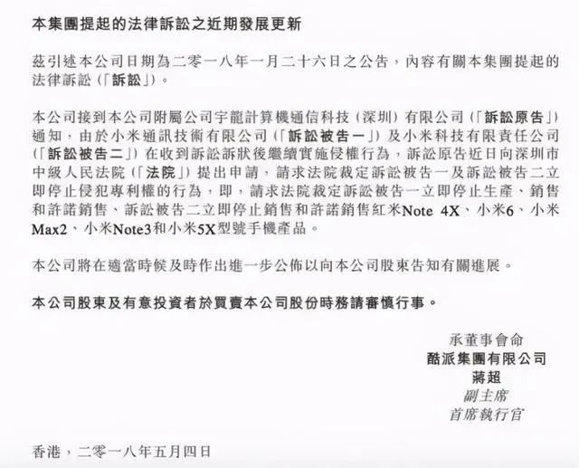 ◆ 2018年5月10日,在小米提交赴港IPO申請后,酷派集團(tuán)再一次發(fā)布公告表示,小米集團(tuán)的多款手機(jī)侵犯了酷派的專利權(quán),要求小米集團(tuán)停止銷售小米MIX 2、紅米Note 5、紅米5 Plus、紅米Note 4X、小米6、小米Max 2、小米Note 3以及小米5X,并賠償經(jīng)濟(jì)損失。