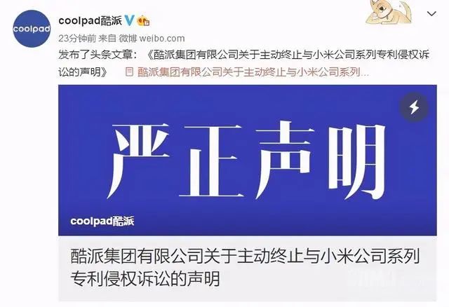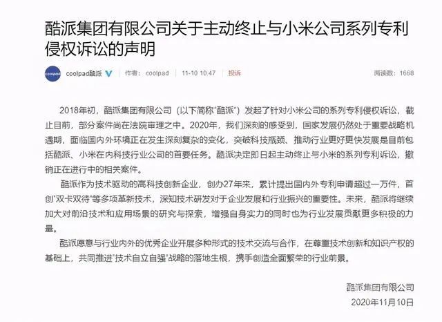 11月10日,酷派發(fā)布了一則名為《酷派集團(tuán)有限公司關(guān)于主動終止與小米公司系列專利侵權(quán)訴訟的聲明》??崤杉瘓F(tuán)在聲明中宣布:即日起主動終止與小米的系列專利訴訟,并撤銷正在進(jìn)行的相關(guān)案件。
