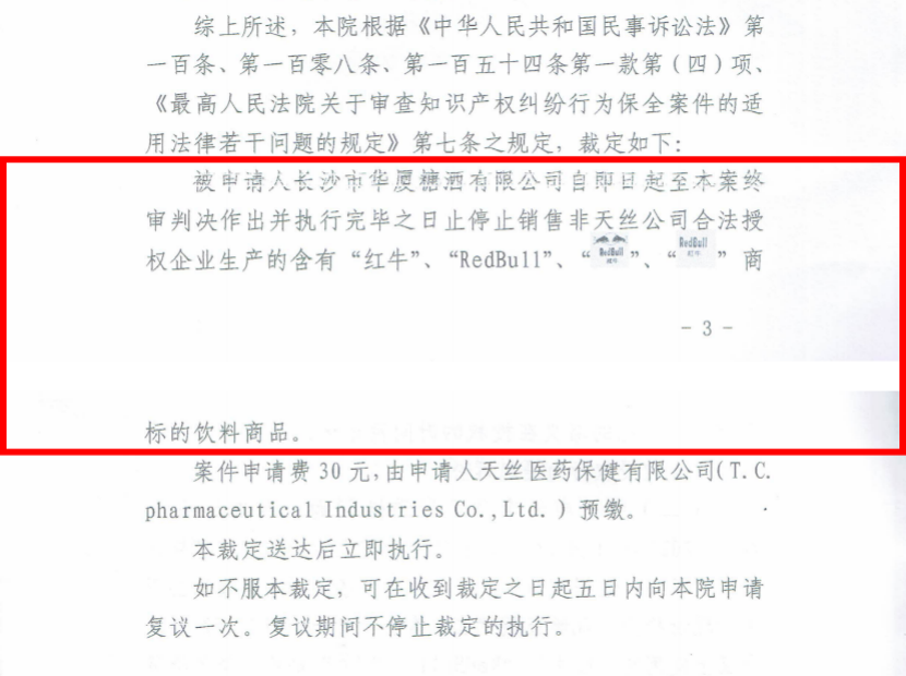 湖南省長沙市中級人民法院經(jīng)審查認為,根據(jù)泰國天絲醫(yī)藥保健有限公司提供的證據(jù)和最高院的判決書查明泰國天絲醫(yī)藥保健有限公司作為“紅?!毕盗凶陨虡说膶S脵?quán)人,其權(quán)利基礎(chǔ)穩(wěn)定。湖南省長沙市中級人民法院依法做出裁定,責令長沙市華廈糖酒有限公司自即日起停止銷售非泰國天絲醫(yī)藥保健有限公司合法授權(quán)企業(yè)生產(chǎn)的紅牛產(chǎn)品,裁定立即開始執(zhí)行。