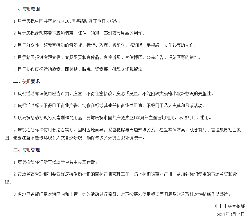 早在3月24日,中宣部就發(fā)布了“中國共產(chǎn)黨成立100周年慶?;顒訕?biāo)識”,并發(fā)文明確了標(biāo)識的使用范圍、使用要求、使用管理等事項。