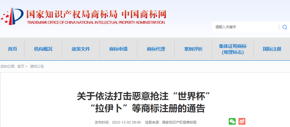 國(guó)家知識(shí)產(chǎn)權(quán)局高度重視卡塔爾世界杯知識(shí)產(chǎn)權(quán)保護(hù)工作,堅(jiān)決打擊惡意搶注行為,依據(jù)《商標(biāo)法》第十條第一款第(七)項(xiàng)等規(guī)定,對(duì)第66999855號(hào)“世界杯”、第63803887號(hào)“LAEEB”等26件商標(biāo)注冊(cè)申請(qǐng)予以駁回;依據(jù)《商標(biāo)法》第四十四條第一款規(guī)定,對(duì)已注冊(cè)的第63767652號(hào)“LAEEBS”商標(biāo)依職權(quán)宣告無(wú)效。