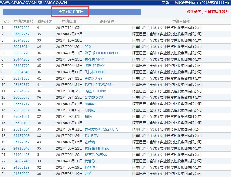 隨后,小編查詢了“阿里巴巴(全球)實(shí)業(yè)投資控股集團(tuán)有限公司”在商標(biāo)局網(wǎng)站上的商標(biāo)注冊(cè)情況,在商標(biāo)局網(wǎng)站查詢,這家頻繁更名的公司在內(nèi)地申請(qǐng)的商標(biāo)多達(dá)61件,包括“一帶一路”“亞投聯(lián)”“eWTP”等全球經(jīng)濟(jì)領(lǐng)域熱門話題,還有“獅子幣”“飛幣”“亞幣”“A ALICOIN”“飛比特”“飛鏈”“合約鏈”等區(qū)塊鏈和CIO行業(yè)詞匯,還有香港衛(wèi)視熱門節(jié)目“壹周達(dá)人秀”等名稱。