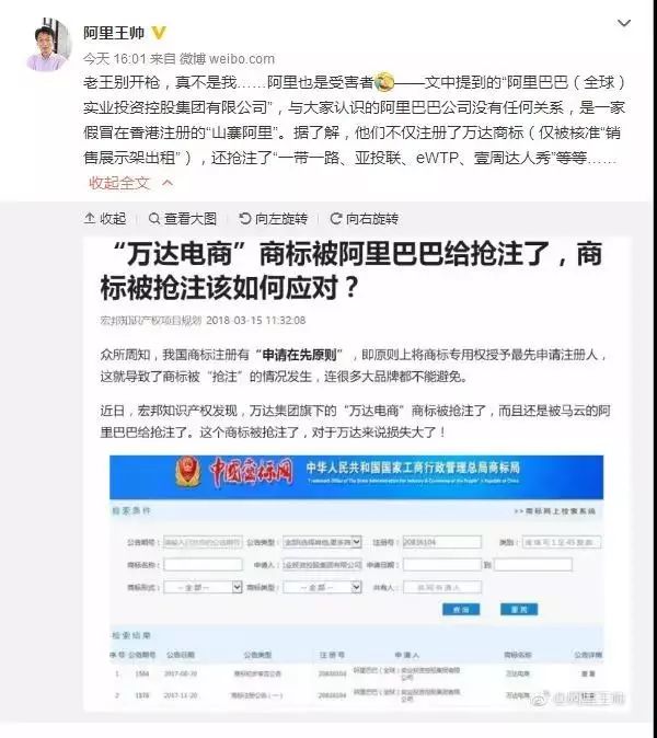 “文中提到的阿里巴巴(全球)實(shí)業(yè)投資控股集團(tuán)有限公司,與大家認(rèn)識(shí)的阿里巴巴公司沒有任何關(guān)系,是一家假冒在香港注冊(cè)的‘山寨阿里’。據(jù)了解,他們不僅注冊(cè)了萬達(dá)商標(biāo)(僅被核準(zhǔn)‘銷售展示架出租’),還搶注了一帶一路、亞投聯(lián)、eWTP、壹周達(dá)人秀等等……阿里也是受害者,所以,老王別開槍,真不是我……”