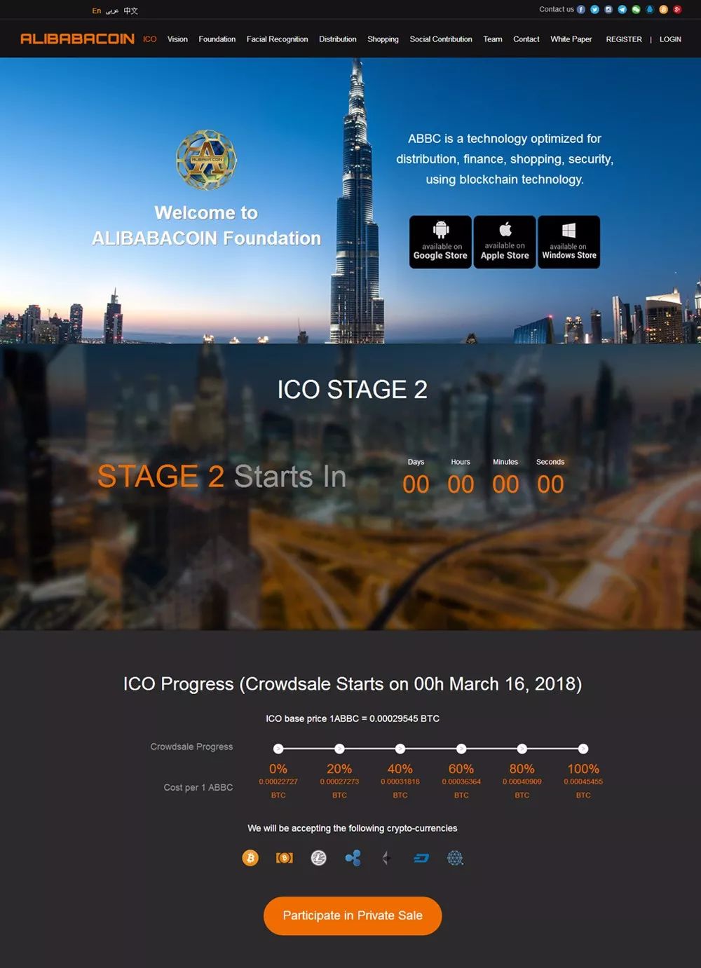 從其官網(wǎng)(abbcfoundation.com)獲悉,本次ICO(首次幣發(fā)行)中,每一個AlibabaCoin代幣(ABBC)的基準價格是0.00025比特幣,目前已經(jīng)募集超過350萬美元,預(yù)計將于今年第二季度完成ICO。這些代幣不僅可以在數(shù)字貨幣市場進行交易,也可以用于商店的“刷臉”支付。