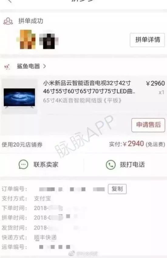 有用戶在拼多多上花 2960 元買到了 65 英寸小米新品云智能語音電視,到貨后發(fā)現(xiàn)該電視的前面板 Logo 確實(shí)是“小米新品”。