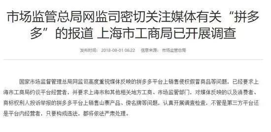 8月1日,國家市場監(jiān)督管理總局公告稱,高度重視媒體反映的拼多多平臺(tái)上銷售侵權(quán)假冒商品等問題,已經(jīng)要求上海市工商局約談平臺(tái)經(jīng)營者,要求上海市和其他相關(guān)地方工商、市場監(jiān)管部門,對媒體反映的以及消費(fèi)者、商標(biāo)權(quán)利人投訴舉報(bào)的拼多多平臺(tái)上銷售山寨產(chǎn)品、傍名牌等問題,認(rèn)真開展調(diào)查檢查,不管是第三方平臺(tái)還是平臺(tái)內(nèi)經(jīng)營者,只要構(gòu)成違法,都將依法嚴(yán)肅處理。