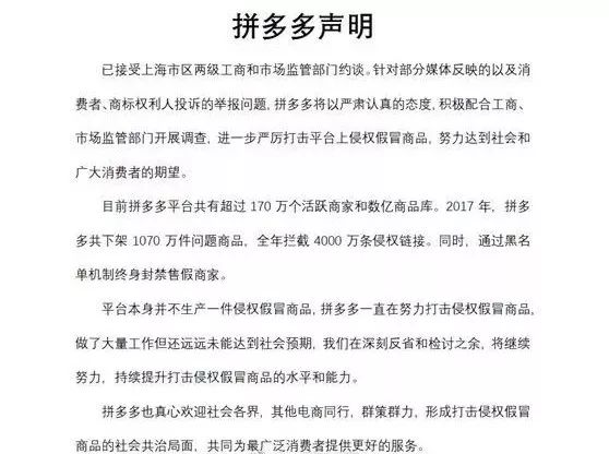據(jù)最新消息稱,拼多多發(fā)表聲明并回應(yīng)稱,將全力配合工商、市場監(jiān)管部門開展調(diào)查,進(jìn)一步嚴(yán)厲打擊平臺(tái)上侵權(quán)假冒商品,努力達(dá)到社會(huì)和廣大消費(fèi)者的期望。同時(shí),拼多多表示,真誠歡迎社會(huì)各界群策群力,形成打擊侵權(quán)假冒商品的社會(huì)共治局面。