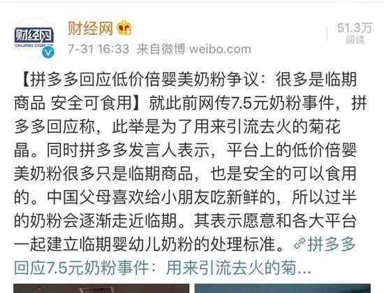 拼多多聯(lián)合創(chuàng)始人達(dá)達(dá)解釋,7.5元的標(biāo)價(jià)實(shí)為商家引流時(shí)使用的菊花晶的標(biāo)價(jià),并非奶粉的標(biāo)價(jià),奶粉的標(biāo)價(jià)實(shí)際上是19.9元,與淘寶網(wǎng)同類型產(chǎn)品價(jià)格一致。他宣稱,拼多多平臺(tái)從未出現(xiàn)嬰幼兒假奶粉、過期奶粉。