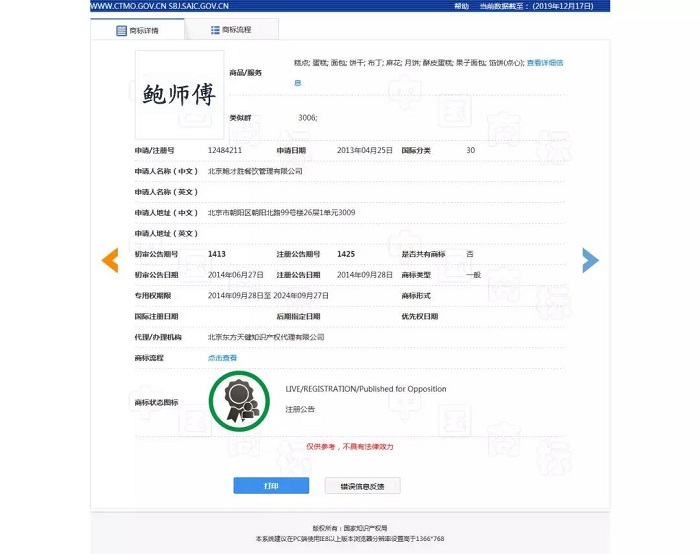 筆者經(jīng)中國(guó)商標(biāo)網(wǎng)查詢了解到,北京易尚公司申請(qǐng)含有“鮑師傅”字樣商標(biāo)共13件,其中只有3件商標(biāo)處于正常注冊(cè)狀態(tài),分別為“鮑師傅”、“鮑師傅”、“鮑師傅小貝”字樣商標(biāo),分別核定使用在第32、43、30類商品類別,而其余10件則處于“異議中、實(shí)質(zhì)審查中、申請(qǐng)被駁回”等狀態(tài)。