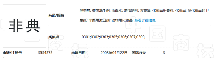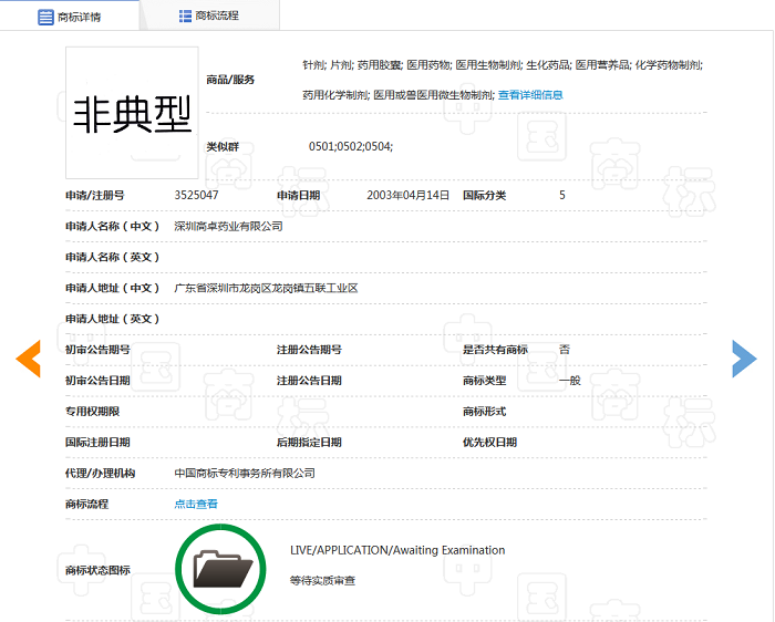 商標網顯示,含有“非典”二字的商標共有57件,其中申請時間最早的是深圳高卓藥業(yè)有限公司在2003年4月11日申請的第3525047號“非典型”商標,商品服務類別包括針劑、片劑等。