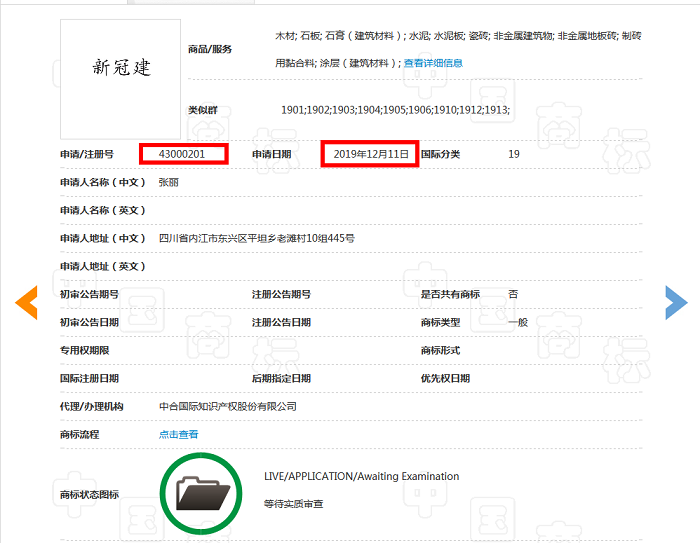 商標網顯示,截止目前,帶有“新冠”二字的商標共有178件,新冠群、新冠炭燒、新冠老麻花、新冠軍、新冠好運等等……但是,這些商標中申請時間最近的為2019年12月11日張麗申請的第43000201號“新冠建”商標,商品服務類別為木材;石板;石膏(建筑材料);水泥;水泥板;瓷磚;非金屬建筑物;非金屬地板磚;制磚用黏合料;涂層(建筑材料)等。