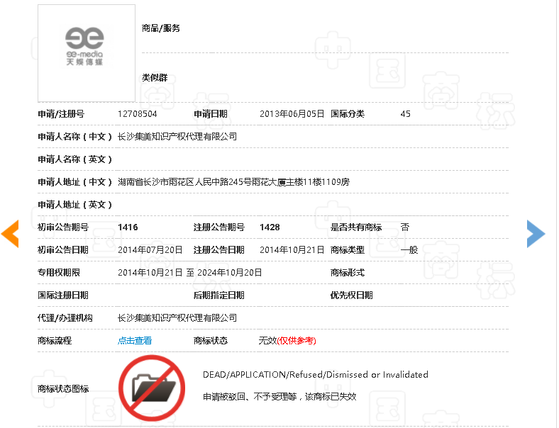 筆者順便查詢了“天娛傳媒”字樣商標(biāo)的注冊(cè)情況,發(fā)現(xiàn)只有兩件,其中一件是上海天娛公司的,即本案涉案商標(biāo),另一件申請(qǐng)于2013年,目前處于申請(qǐng)被駁回狀態(tài),該商標(biāo)的圖片與上海天娛公司的商標(biāo)也是極其相似,看來“天娛傳媒”商標(biāo)并不是第一次碰到傍名牌者了。