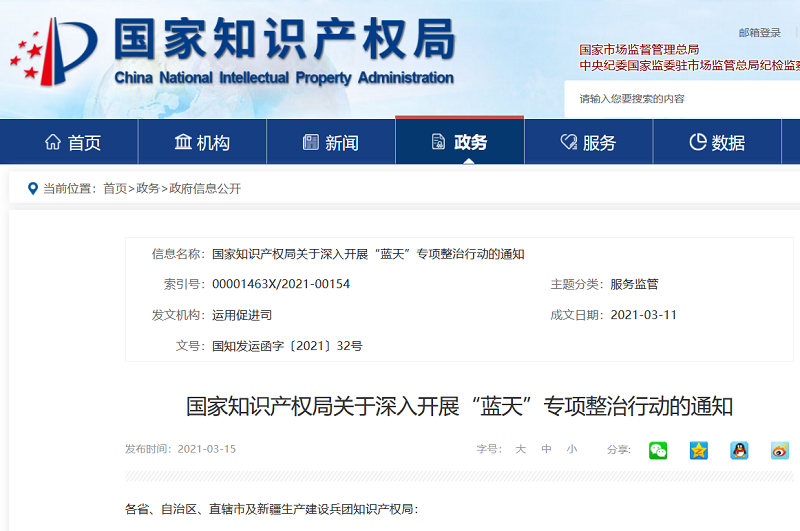國家知識產(chǎn)權(quán)局關于深入開展“藍天”專項整治行動的通知