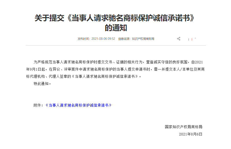 為嚴(yán)格規(guī)范當(dāng)事人請求馳名商標(biāo)保護(hù)時提交文書、證據(jù)的相關(guān)行為,營造誠實守信的良好氛圍,自2021年9月1日起,在異議、評審案件中請求馳名商標(biāo)保護(hù)的當(dāng)事人提交申請書時,需一并提交本人/本單位及其商標(biāo)代理機(jī)構(gòu)、代理人簽章的《當(dāng)事人請求馳名商標(biāo)保護(hù)誠信承諾書》。
