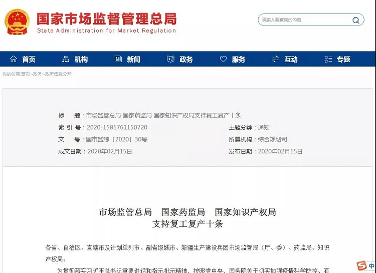 各級(jí)市場(chǎng)監(jiān)管、藥監(jiān)、知識(shí)產(chǎn)權(quán)部門(mén)要加強(qiáng)組織領(lǐng)導(dǎo),強(qiáng)化責(zé)任擔(dān)當(dāng),緊密結(jié)合各地實(shí)際,把十條政策措施進(jìn)一步細(xì)化,落實(shí)落細(xì)落到位,更好服務(wù)于企業(yè)復(fù)工復(fù)產(chǎn)工作,堅(jiān)決打贏疫情防控阻擊戰(zhàn)。