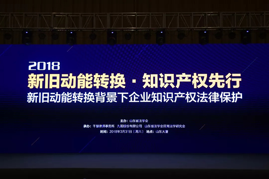 2018年3月31日,由山東省法學(xué)會主辦,千慧知識產(chǎn)權(quán)公司、九陽股份有限公司、山東省法學(xué)會民商法學(xué)研究會共同承辦的“新舊動能轉(zhuǎn)換背景下企業(yè)知識產(chǎn)權(quán)法律保護(hù)”主題論壇在山東大廈金色大廳舉行,最高人民法院,山東省高級人民法院,濟(jì)南市中級人民法院的法官和山東大學(xué)法學(xué)院的教授們做精彩演講,全省300多位企業(yè)家,企業(yè)法務(wù)負(fù)責(zé)人和知識產(chǎn)權(quán)負(fù)責(zé)人參加會議,共同探討企業(yè)知識產(chǎn)權(quán)保護(hù)問題。